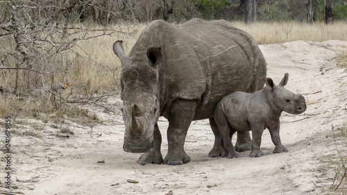 Naklejka premium How cute is a baby rhinoceros and it's mom?