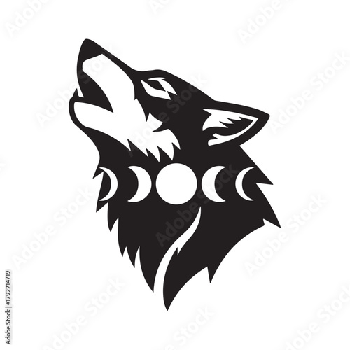 © Chaina, Obraz premium Howling Wolf with Moon Phases Black White Vector Icon