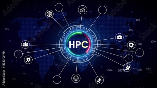 Obraz premium HPC High Performance Computing Network Hub with Global Map and Icons image photo