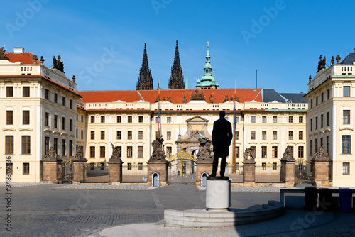 Naklejka premium Hradcany square with entrance gate to Prague Castle and statue of Tomas Garrigue Masaryk - the first President of Czechoslovakia, Praha, Czech Republic