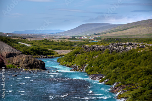 © Maygutyak, Fototapeta premium Hraunfossar series of waterfalls formed by rivulets streaming ov