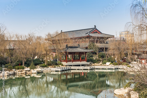 Fototapeta premium HUAQING, CHINA, 25 DECEMBER 2017: Landscape of a lake and a traditional...