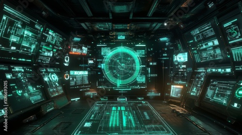 Fototapeta premium HUD (Graphical User Interface), illustration with tech circles in green, neon...