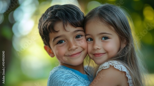 © Rajiv, Fototapeta premium hug and portrait of brother and sister enjoying summer day for bonding, quality time and playing. Family, children and happy siblings hugging, embrace and loving in nature for relaxing, Generative AI