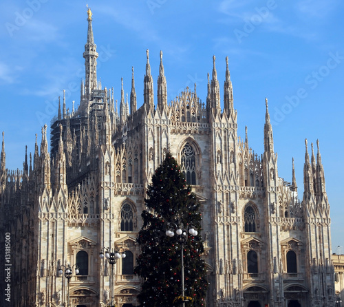 © ChiccoDodiFC, Fototapeta premium huge Christmas tree with red and silver balls in front of the sp