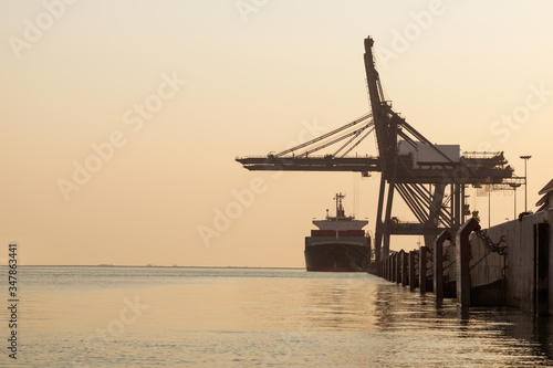 © Cherdchai, Obraz premium Huge container cargo ship on harbor