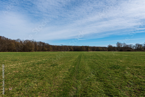 Fototapeta premium Huge early springtime meadow with forest around and blue sky with clouds