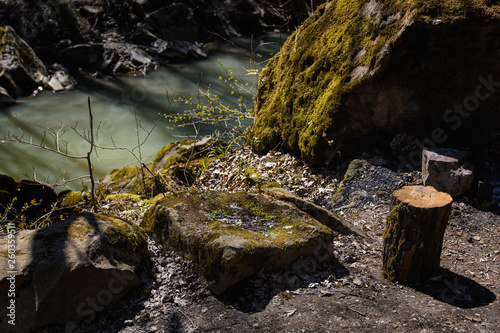 © Algus, Fototapeta premium Huge fairy stones (boulders) covered with green moss are among the trees in the forest next to the mountain river
