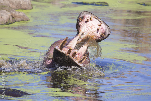 © Alta Oosthuizen, Fototapeta premium Huge hippo opens his mouth wide to scare off enemies