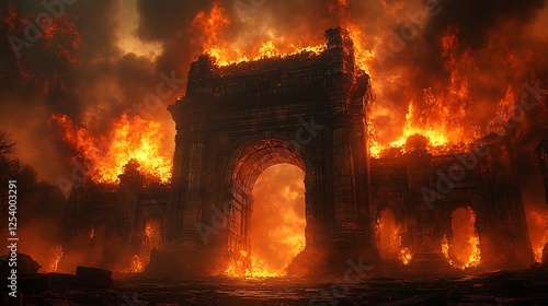 © Kenny Parker, Fototapeta premium Huge skeletal archway with flames erupting from cracks in the stone