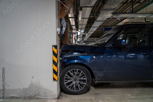 © sommersby, Obraz premium Huge SUV drove into a door in the wall in an underground parking lot at speed