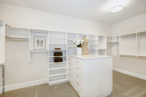 © Iriana Shiyan, Fototapeta premium Huge walk-in closet with shelves, drawers and clothes rails