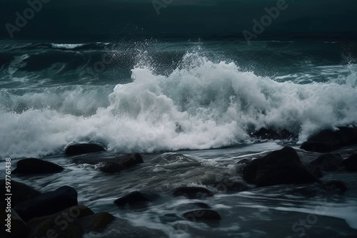 Fototapeta premium Huge waves in sea at storm. Digitally generated AI image