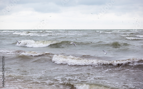 Fototapeta premium Huge waves raging in the sea and seagulls in the spray of waves. Storm at sea. Birds fly over the waves. Nature, environment, rough weather, danger