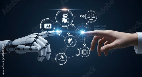 Fototapeta premium Human and AI collaboration: Secure future technologies, innovative solutions for global challenges, ethical considerations, and responsible development of artificial intelligence.