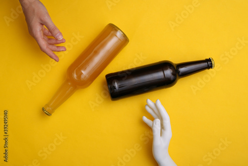 © splitov27, Naklejka premium Human and mannequin hand touching beer bottle on yellow background