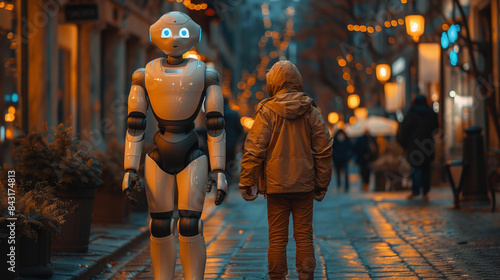 © Daniel, Obraz premium Human and robot together on city street, human-robot interaction concept