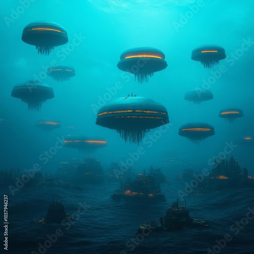 © Kankamol Tama, Fototapeta premium Human colony on an ocean world with massive underwater cities