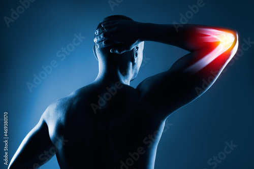 © hamara, Naklejka premium Human elbow joint in x-ray on blue background