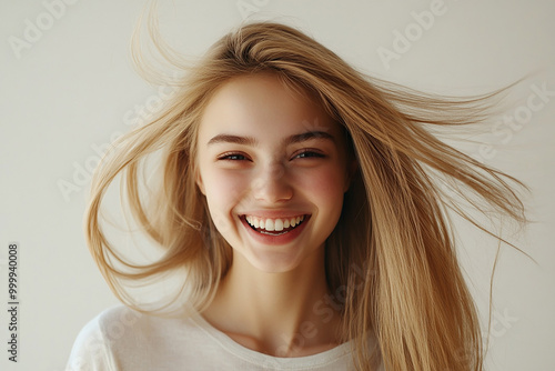 © Oleksii, Fototapeta premium Human face expressions and emotions. Positive joyful young beautiful female with fair straight hair in casual clothing, laughing at joke, looking at camera and pleasantly smiling