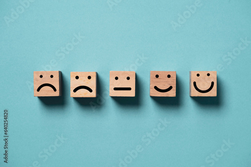 © Dilok, Obraz premium Human face from sad to smile print screen on wooden block cube face on blue background for positive thinking and excellent evaluation rating after use product and service concept.