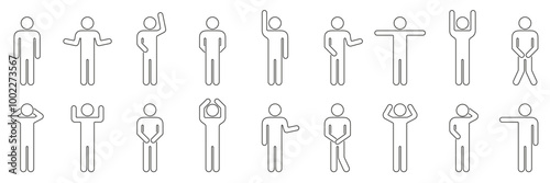 Fototapeta premium Human Figure Line Icons Set in Various Poses. Man Stick Figure with Different Gestures and Poses Outline Symbol Collection. Editable Stroke. Isolated Vector Illustration
