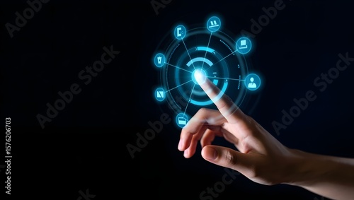 Fototapeta premium Human finger interacting with futuristic digital interface displaying icons