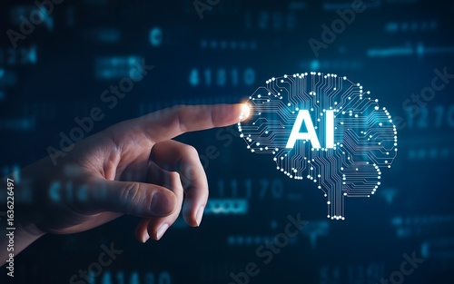 © SD AI, Naklejka premium Human finger touching artificial intelligence brain circuit technology