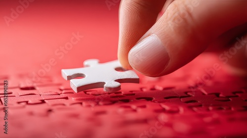 © Adi, Obraz premium Human Hand Aligning Final Puzzle Part on Red Surface Showing Connection, Accuracy, and Precision