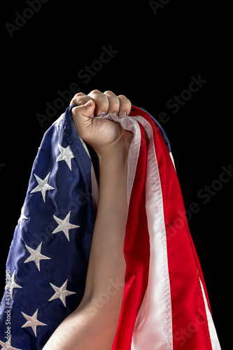 Fototapeta premium Human hand holding national American flag. USA Memorial Day, Labour Day,...