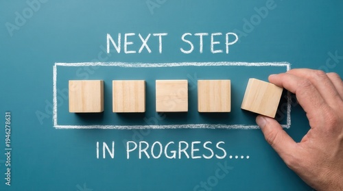 © AspctStyle, Fototapeta premium Human hand placing wooden block to complete next step progress bar on teal background for business project management concept