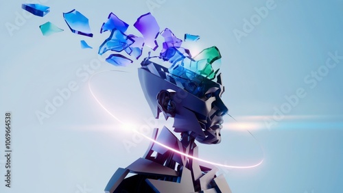 © Taqinaya, Obraz premium Human head 3D rendered with shards of glass exploding outward symbolize artificial consciousness emergence. Abstract technology concept