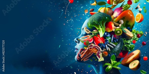 Naklejka premium Human profile made of fresh fruits and vegetables, set against a blue background, symbolizing healthy eating and nutrition with ample copyspace.