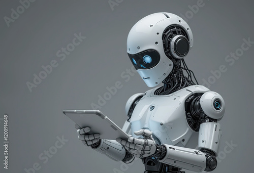 © IQ-Photography, Fototapeta premium human robot using tab isolated PNG, Transparent background