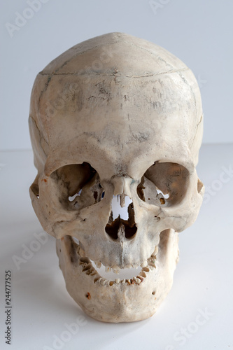 © Ilmar, Obraz premium Human skull full face on light gray background. Close up.