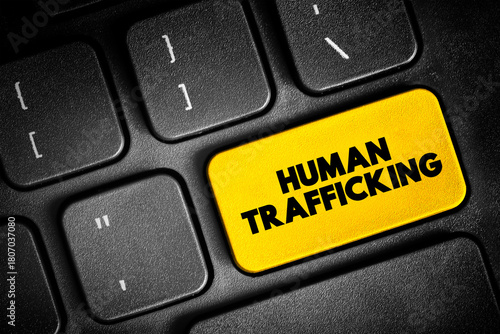 Fototapeta premium Human Trafficking is the trade of humans for the purpose of forced labour, text button on keyboard, concept background