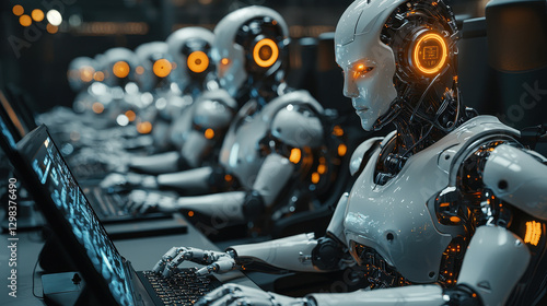 © Leopard, Fototapeta premium Humanoid AI robots and programmers collaborate in a high-tech co-working space for software development