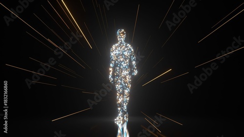 © flashmovie, Fototapeta premium Humanoid figure made of sparkling diamonds materializing and walking toward the camera through a futuristic tunnel of light, representing concepts of creation, ai, and digital reality