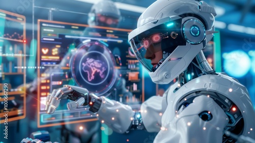 © thekob5123, Fototapeta premium Humanoid Robot Assisting Engineer in Development Task
