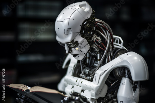 Fototapeta premium Humanoid robot cyborg reading a book and acquiring new data, representing the...