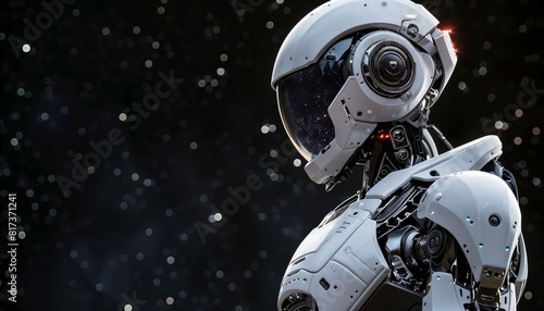 Fototapeta premium Humanoid robot on a cosmic black background. Global robotic astrophysics research for unveiling celestial mysteries.