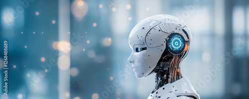 © Margarita Ratatosk, Obraz premium Humanoid robot profile with glowing blue eye against blurred background. AI technology concept. Future of artificial intelligence and machine learning visualization.