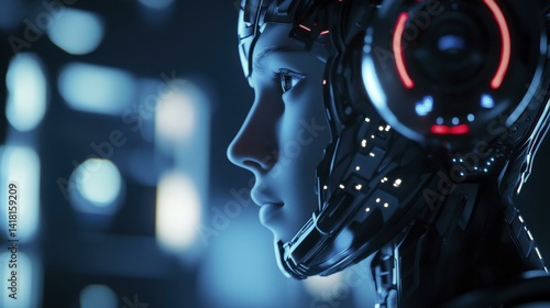 © Dari, Fototapeta premium Humanoid Robot Side Profile with Glowing Lights in Cityscape at Night