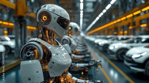 © Igas Studios , Fototapeta premium Humanoid Robot Working in a Futuristic Car Factory