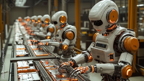 © Paniti, Fototapeta premium Humanoid robots perform repetitive tasks in manufacturing, increasing efficiency