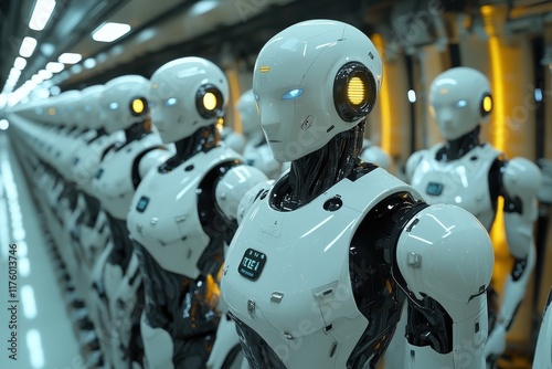 © Sergiy, Fototapeta premium Humanoid robots stand in formation ready for deployment in a futuristic manufacturing facility