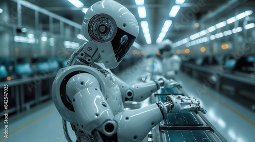 Fototapeta premium Humanoid Robots Working on a High-Tech Assembly Line in a Futuristic Factory