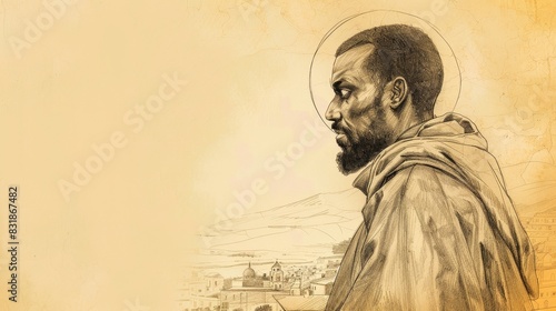 © T Studio, Fototapeta premium Humble Setting, St. Benedict the Moor with Sicilian Countryside, Biblical Illustration, Beige Background, Copyspace
