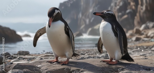 © Narawon, Obraz premium Humboldt penguin preening feathers on rocky shore, spheniscus humboldti, waddle