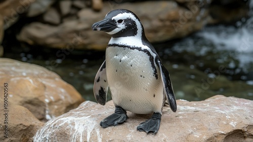 Naklejka premium Humboldt Penguin Standing on Rocks Near Water